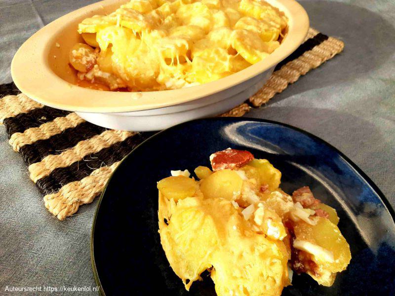 - Vet een ovenschaal in en bedek de bodem met de helft van de aardappelen.