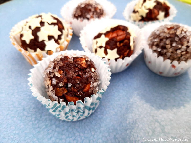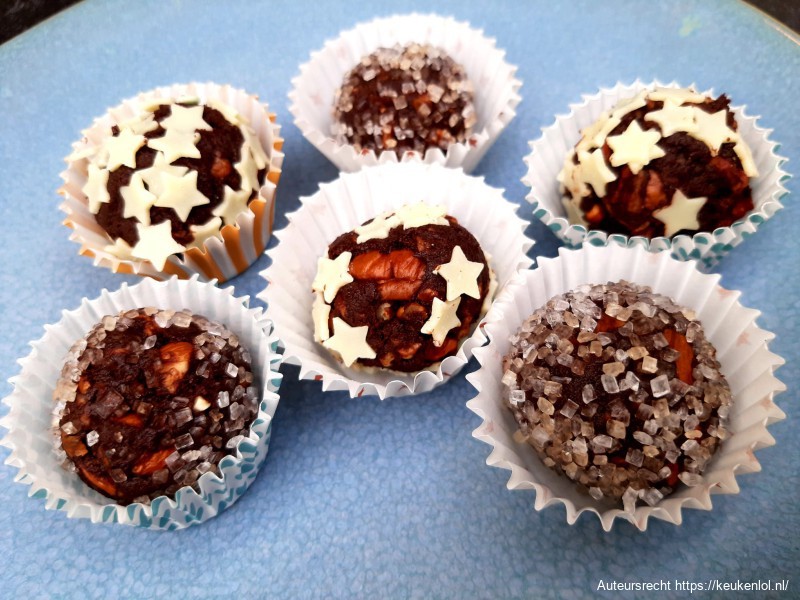 - Rol de balletjes door strooisel naar keuze en laat ze kort opstijven in de koelkast.