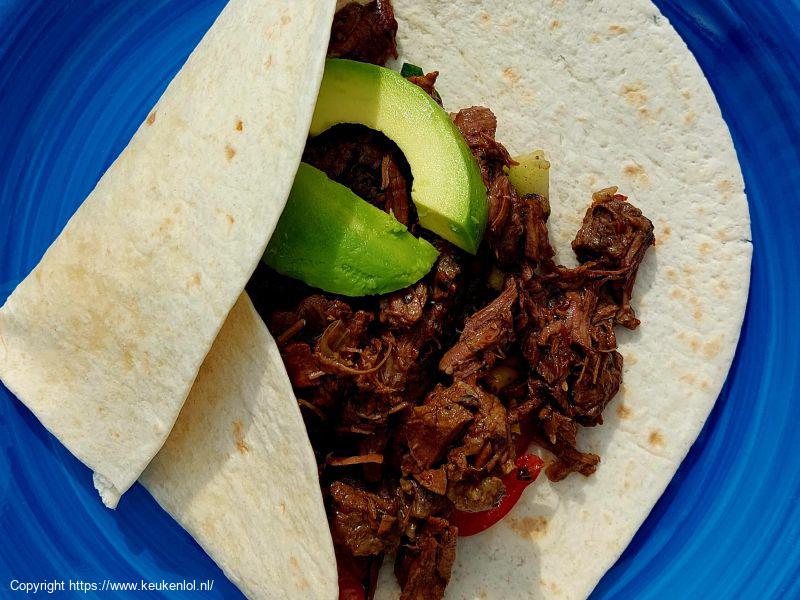 - Officieel moet je het vlees uit elkaar trekken na de bereiding zoals bij pulled pork. Dit heb ik niet gedaan deze keer maar het vlees samen met de salsa op een wrap geserveerd.