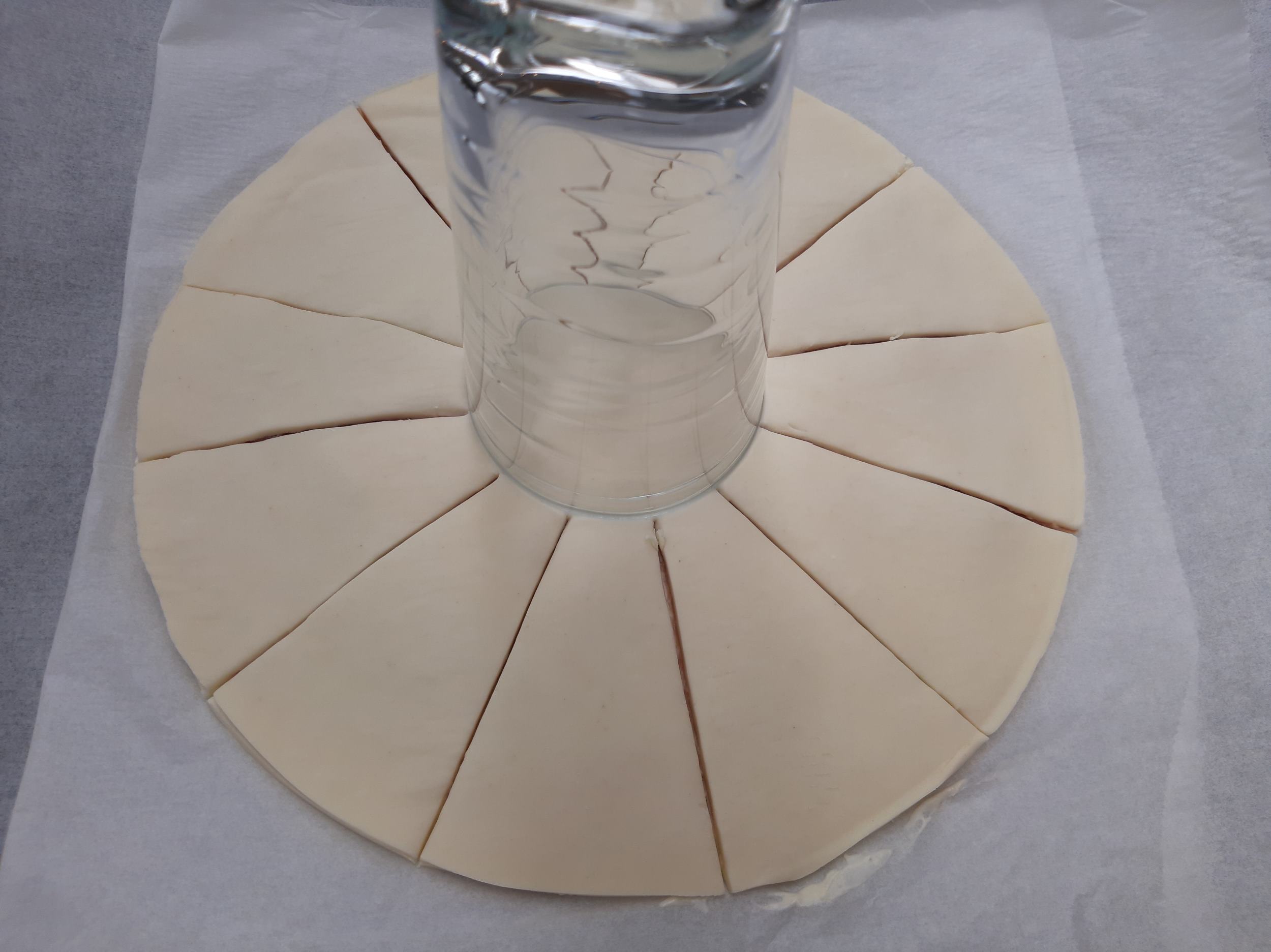 - Zet in het midden van de cirkel een glas en snijd rondom 12 keer in.